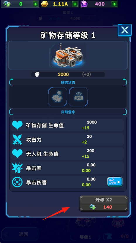 2、点击进入矿物存储界面,消耗140个水晶绿色资源并点击两次升级按钮,以此提升存储设施的生命值、攻击力等属性,从而实现基地的强化。