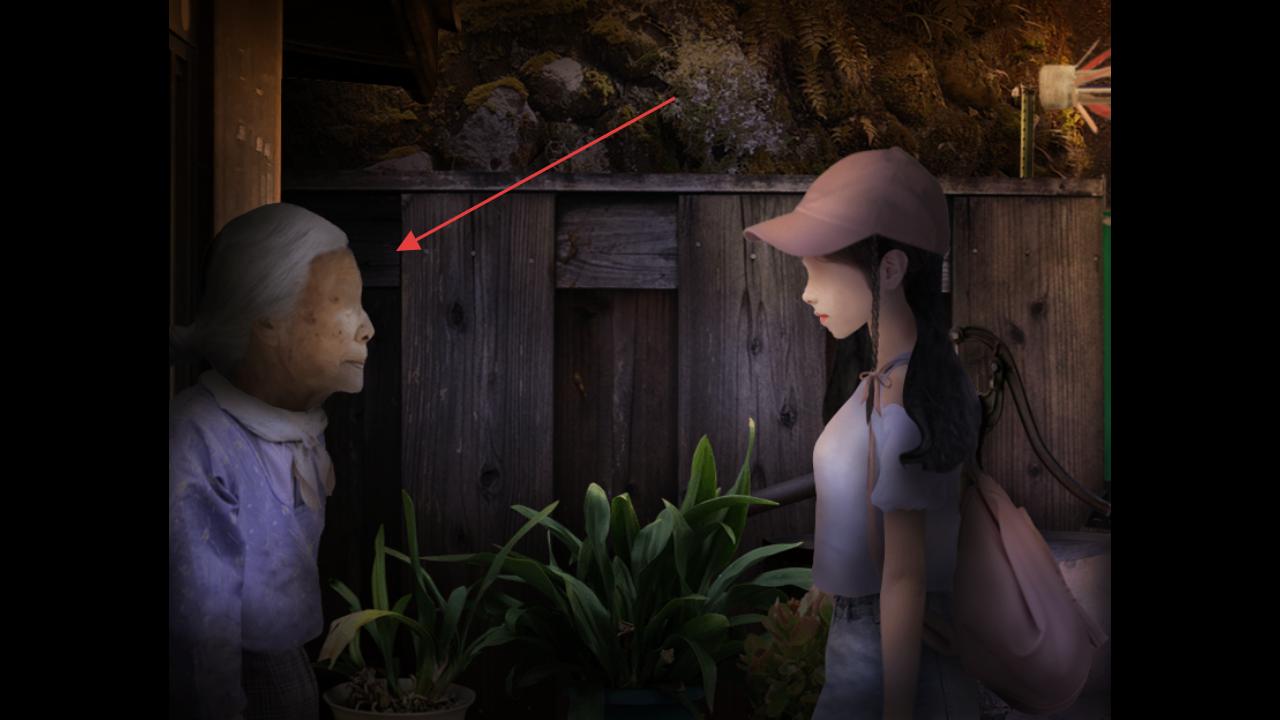 3、在庭院里偶遇奶奶,和她互动交流,触发对话后,能了解奶奶的近况以及这个家的过往故事,还能从奶奶那里得到线索,让剧情进一步展开,从而体会到家庭氛围包裹下的故事脉络。