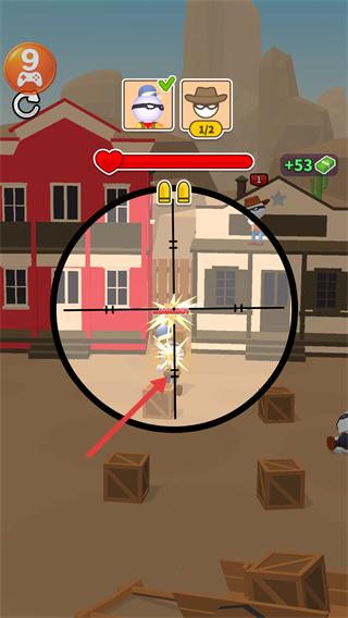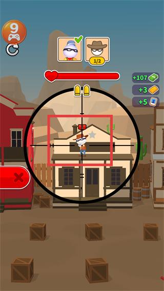 3、对准建筑上剩下的牛仔目标进行射击,完成【2/2】的进度后,就能得到【+107】之类的额外奖励。