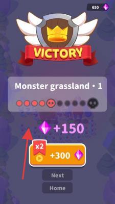 1、战斗获胜后,在结算页面领取“Monstergrassland·1”和钻石奖励,点击“Next”进入新关卡。
