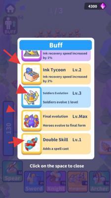 2、战斗开始前,需要挑选兵种(如Spear、Archer等)进行部署,同时搭配各类Buff(像“InkTycoon”这类能提升资源的效果),以此来增强整体的战斗能力。
