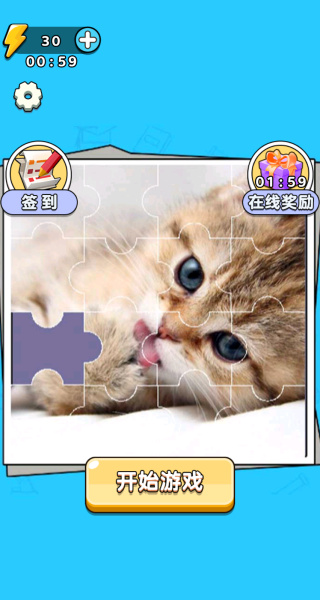 打开游戏后,映入眼帘的是一只可爱猫咪酣睡的画面,点击“开始游戏”按钮即可进入游戏。