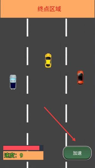 2、避开左右两侧的蓝、红车辆,沿直线全力冲向终点区域,同时维持领先的速度(例如保持在9左右)。