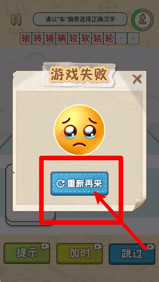 3. 若回答错误或者超出时间限制,页面会展示“游戏失败”的提示,并配备“重新再来”的按钮;同时,底部依然保留提示、加时以及跳过这几项功能。