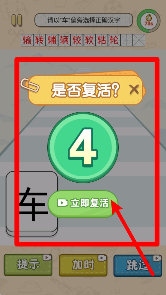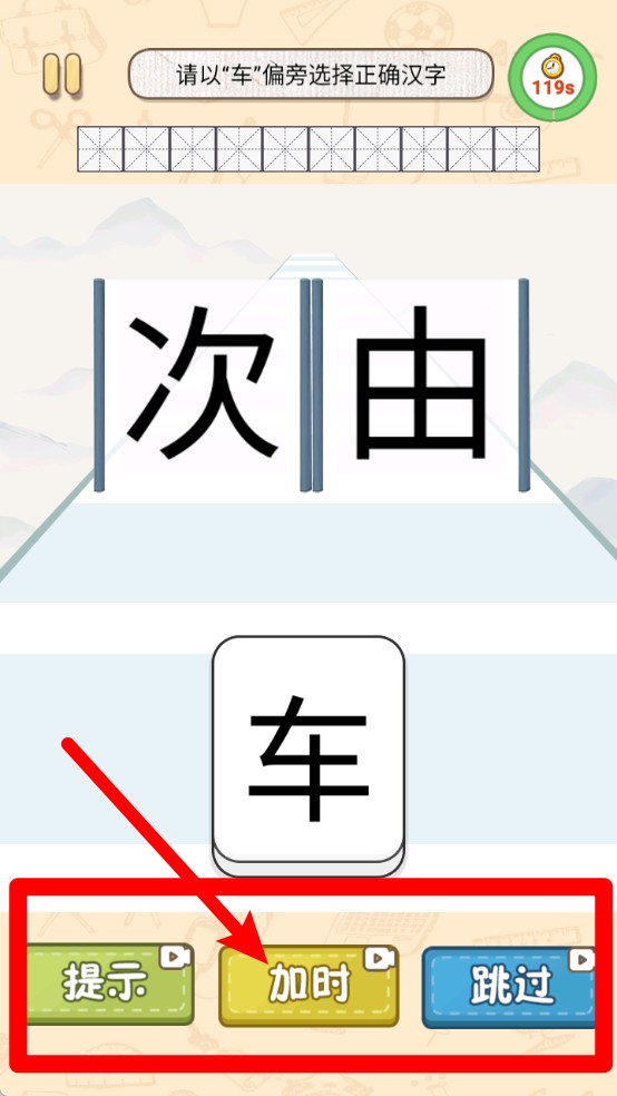 1. 本关卡要求根据提示选择带有“车”字旁的汉字,界面上方设有计时器,底部的提示、加时和跳过按钮可辅助完成解题。
