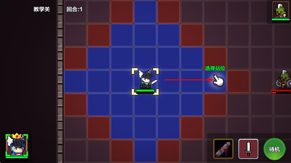 1、回合开始时,点击角色后,选择可移动的蓝色方格来调整角色的站位,以此为攻击敌方或躲避敌方攻击做好准备。