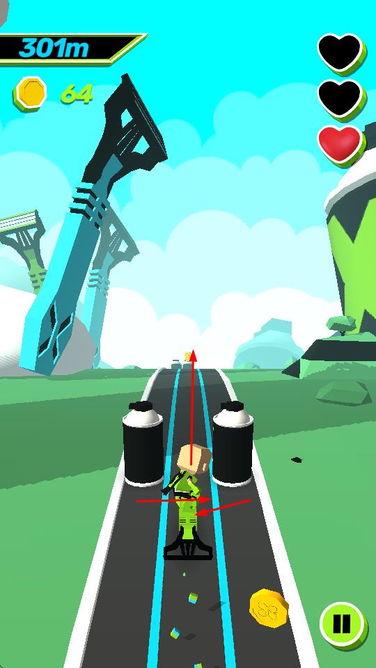 1、进入游戏后,控制角色在赛道上向前移动,通过拾取金币来提升分数,同时要留意避开障碍物,比如带有标识的黑色物体之类的。