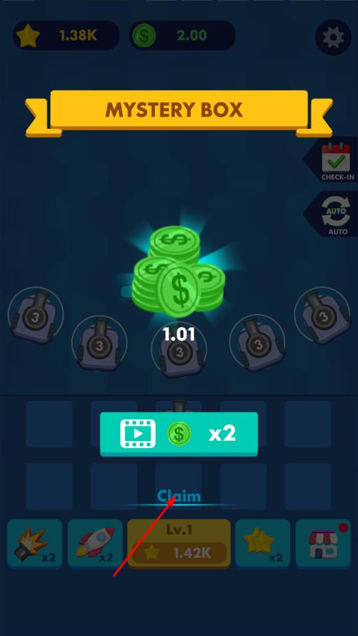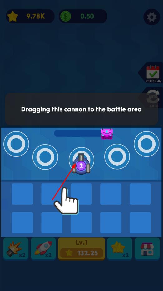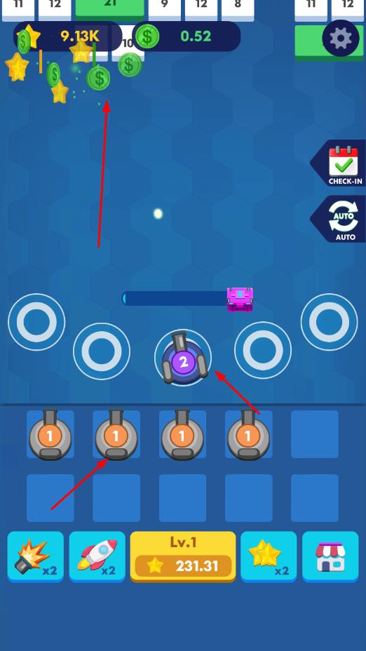 在战斗进行时,炮台会主动攻击其上方的方块;当方块被成功摧毁后,会有金币掉落。玩家可使用这些金币购买新的炮台,并将其布置在合适的位置,以此增强自身的防御能力。