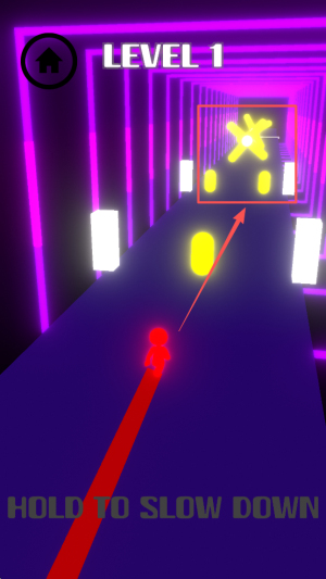 3、接着,按住屏幕的任意一处来触发“HOLD TO SLOW DOWN”机制,通过精准把控角色的下落速度,从而避开障碍物。