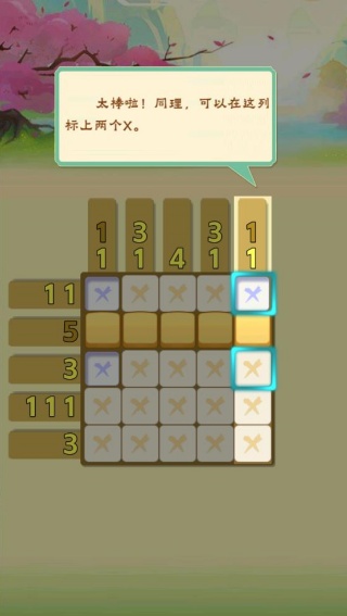 2、进入游戏后跟着新手指引走,弄明白行列数字的含义以及涂色、打叉的规则,借助基础教程学会解题逻辑,这样就能为之后的闯关做好准备。