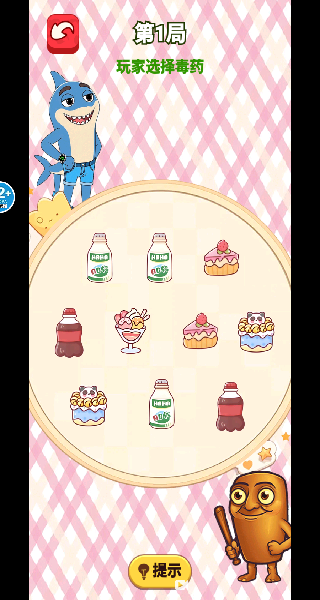 1、每一局开始的时候,要从给定的零食里悄悄选定一种当作毒药,并且得保证这个选择能起到迷惑作用,不容易被对方看穿。