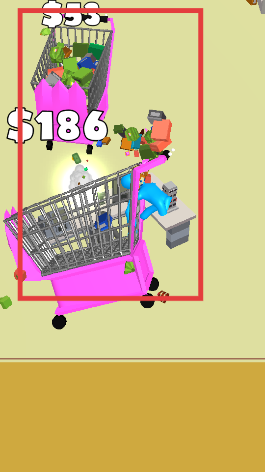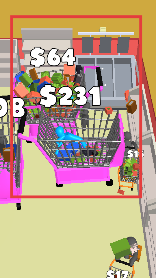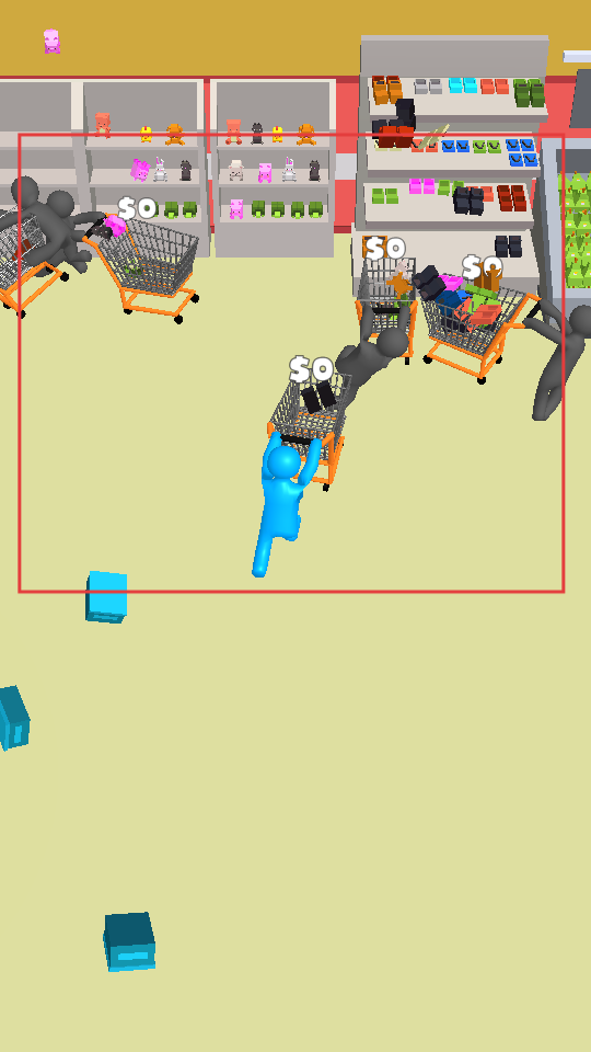 1、操控蓝色角色推着购物车,在超市场景中移动,从货架上收集各式各样的物品并放进购物车,以此积累物品的总价值。
