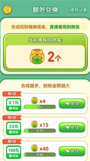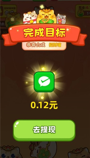 2、合成第一只招财猫即可提现红包,资金会立即到账;合成第二只招财猫时,提现规则与第一只相同,同样是秒到账。