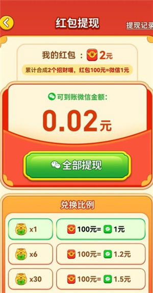1、玩家初始兑换比例设定为1%,后续若合成6个招财猫,该比例可提升至1.2%,如此一来既能增加红包提现额度,合成操作的难度也不会过高。