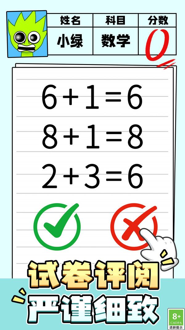 2、新增“试卷评阅”场景,玩家将以老师的身份判断题目正误,从解题者转变为评判者,带来角色身份切换的全新体验。