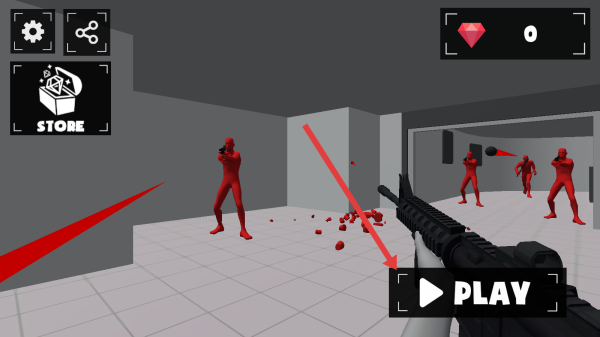 1、进入游戏场景后,需根据箭头提示,点击界面上的PLAY按钮,即可启动与红色敌人对战的射击闯关环节。