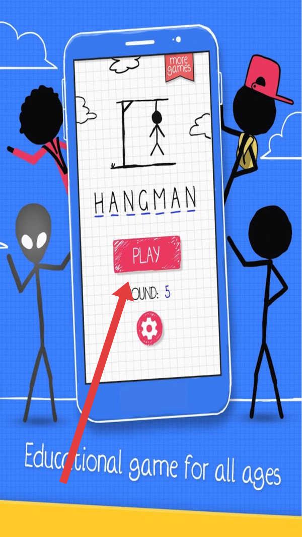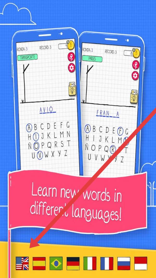 1、在语言选择界面,点击箭头所指的国旗(例如USA国旗),选定英语后,即可进入【Hangman】猜词游戏模式。