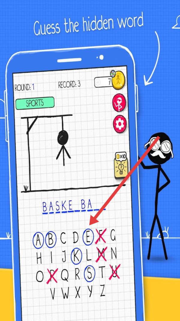 3、猜词过程中,点击箭头所指的字母(像E、K、S这类),把“BASKE_BA__”这个空缺的地方填好,同时要避开标有叉号的字母,这样就能完成解谜了。
