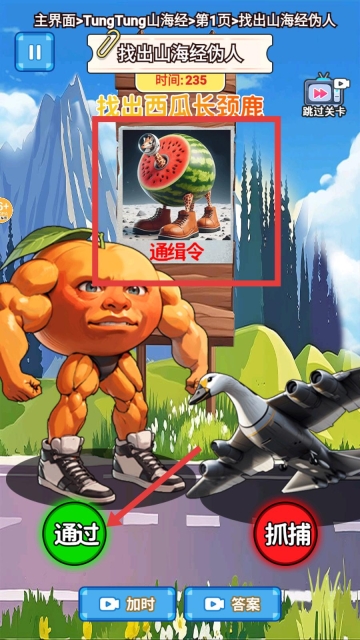 2、关卡中会出现通缉令,上面展示着目标的形象。请仔细观察场景里的角色,辨别其是否为通缉对象;若不是,则可以点击通过按钮。