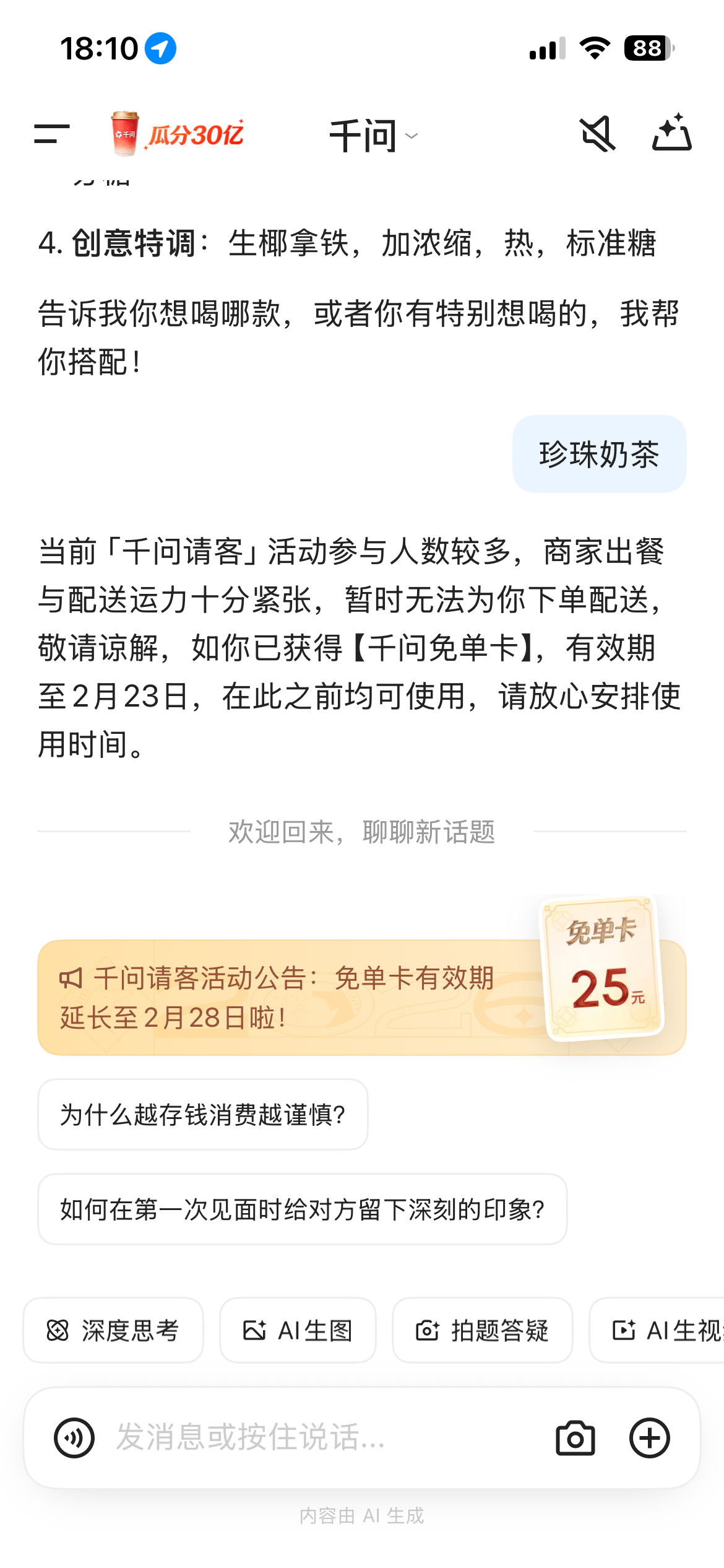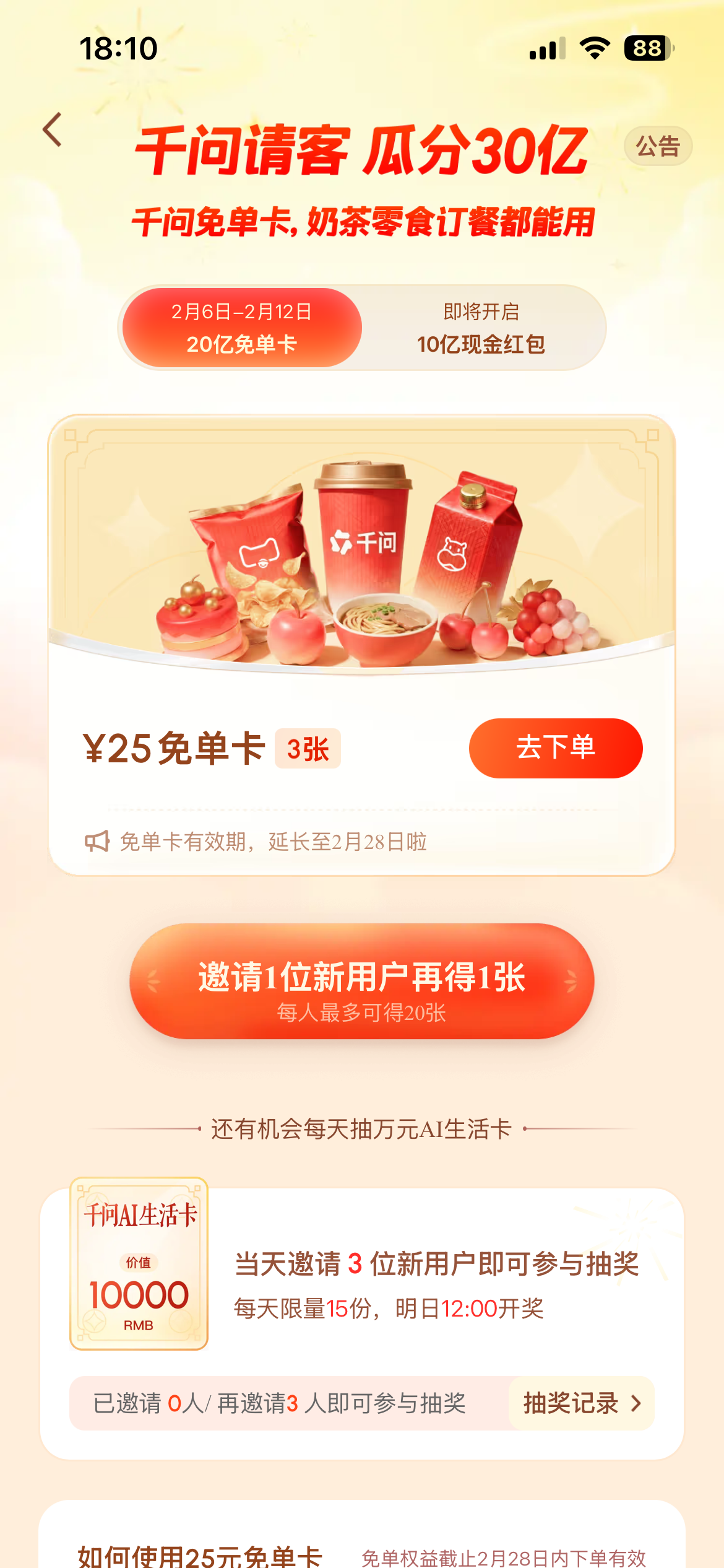 基础权益:所有用户更新千问APP至最新版,即可自动获得1张25元无门槛免单卡