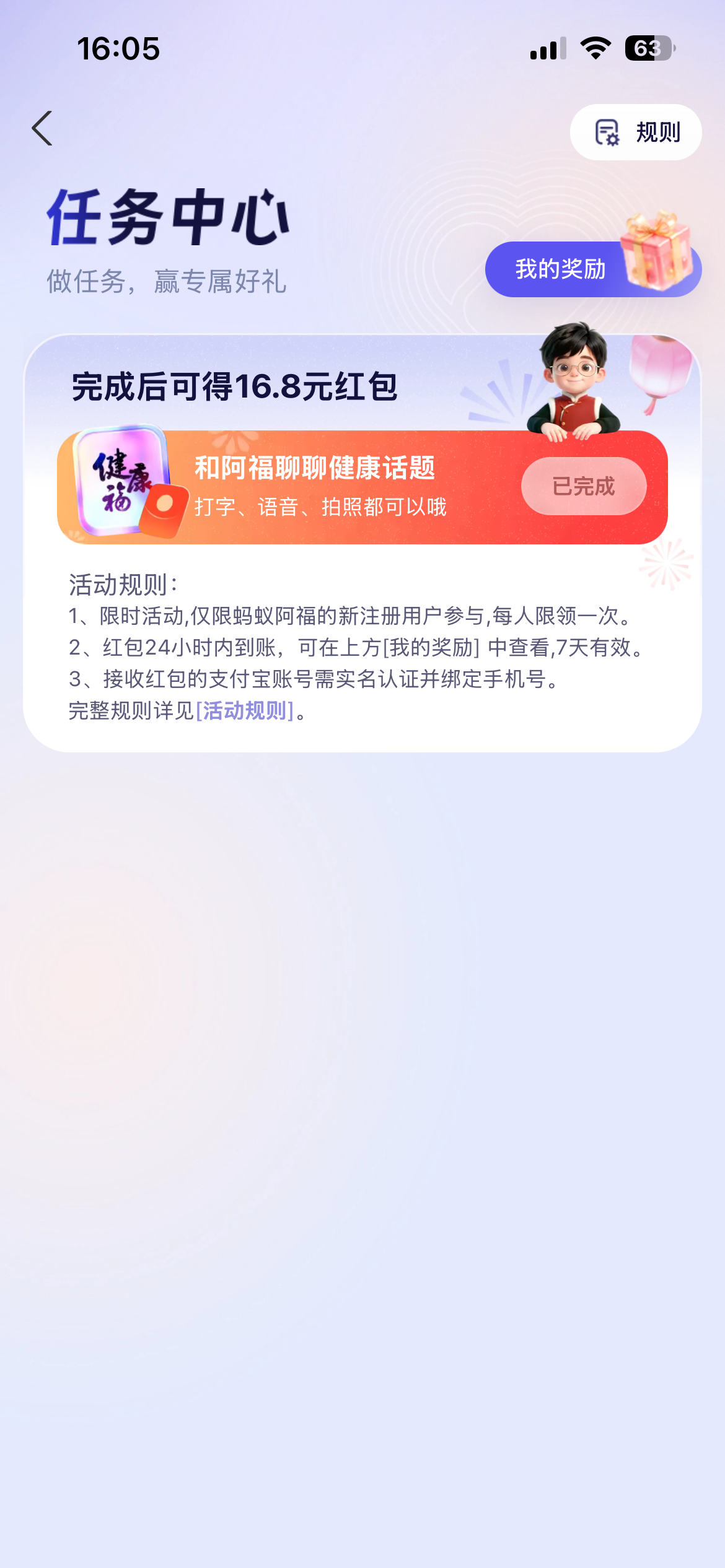 春节期间,AI健康应用赛道再掀热潮。蚂蚁集团旗下AI健康助手"蚂蚁阿福"在2月11日正式推出新人专享活动,新用户注册即可直接领取16.8元支付宝红包,活动时间为2月11日至2月12日,总额度达8400万元,先到先得。